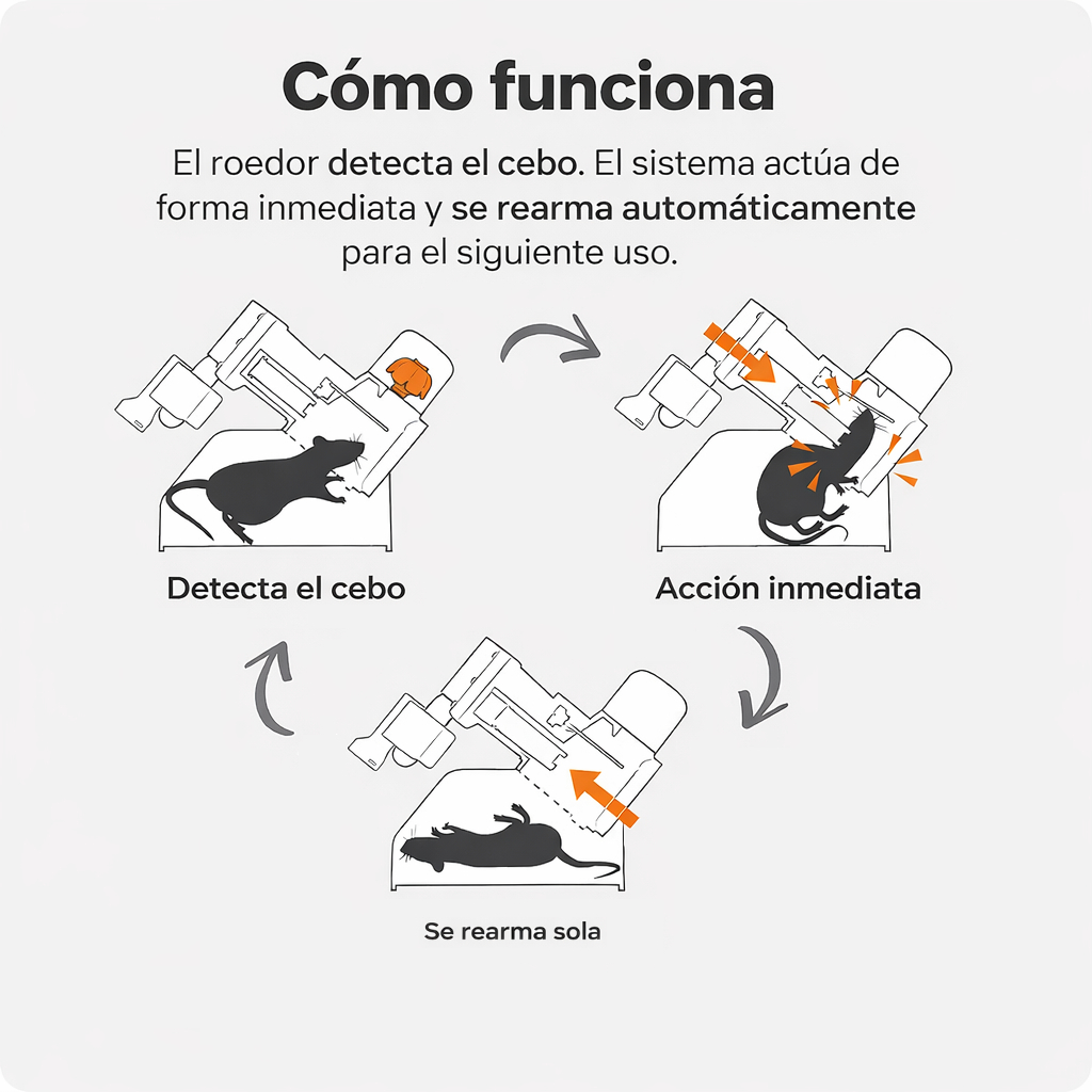 Diseñada para instalar, configurar y olvidarse, esta trampa se reinicia sola y elimina múltiples roedores sin intervención constante.